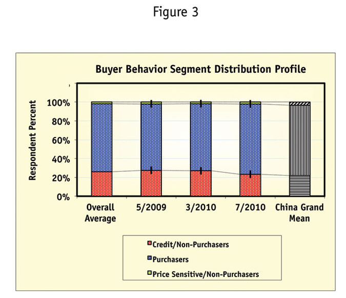 China represents an outlying case, which we have nicknamed “China Syndrome.” Engagement levels were very poor, with some 40 percent of respondents falling into the top-two bar threshold of QMetrics. The range of behaviors being represented was small, with those fitting the “Price Sensitive” segment essentially non-existent. If the data were to be accepted in its raw form, the implication would be profound. An advertising campaign using this data would ignore price as a consideration. We find this to be an absurd conclusion drawn from a sample frame overwhelmed by poorly-engaged respondents who fell out of the other segments including purchasing and purchasing without a credit card (Figure 3).