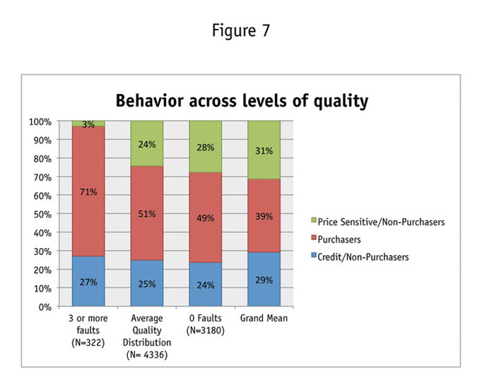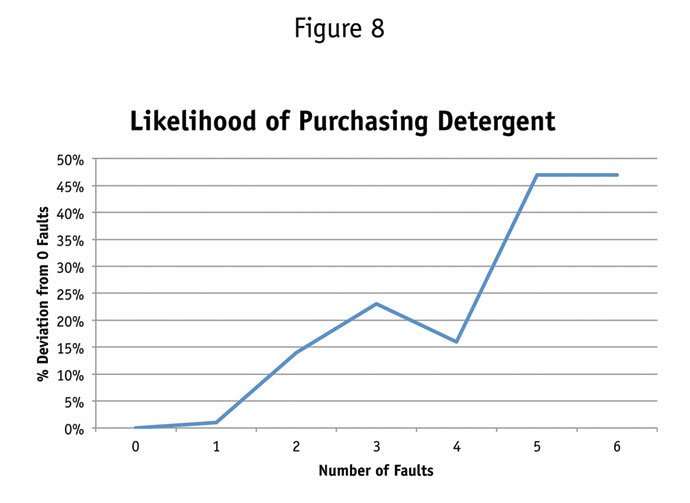 Not all studies track the consistency of online panels around the globe. Most treat subjects considerably closer to home. As an example of a project we treated through a combination of QMetrics and data bias, we offer one on laundry detergent. In our laundry detergent study we were able to create a six-item QMetrics scale and rank respondents by zero to six to faults. The questionnaire did not require the addition of questions to create the metric; we were able to naturally identify good candidates. One seminal question was, “How likely are you to buy any of these detergents?” a fundamental and core question for the vertical. Using respondents with zero faults we could measure the impact of decreasing quality as respondents with no faults were compared to those with one to six (Figure 8).