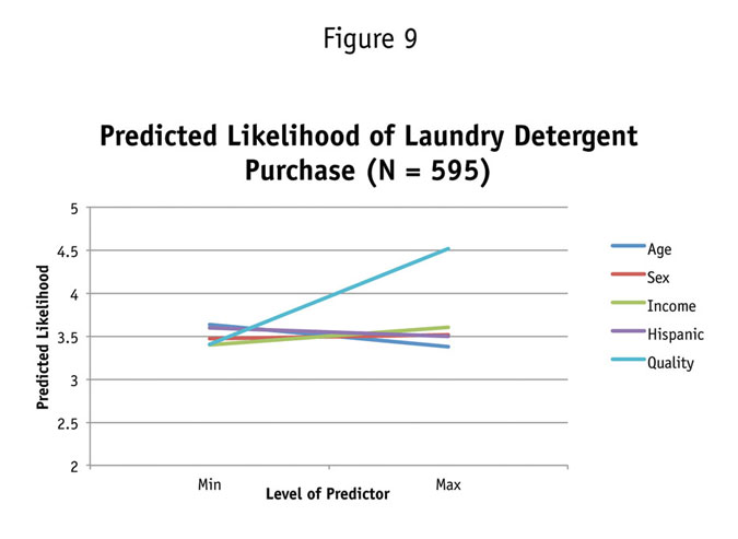 Age, sex, income and race all had less influence on the likelihood of laundry detergent purchase than did the quality (engagement) of a respondent. It is not an outcome that is often part of the report given to a client (Figure 9).