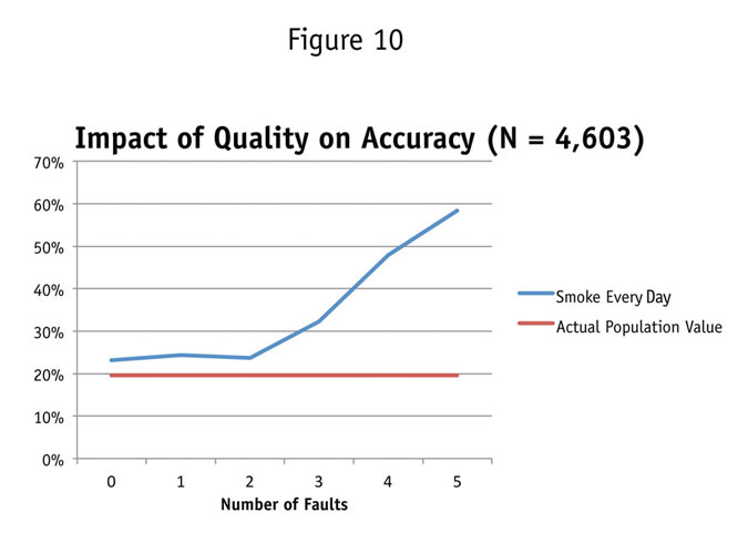 Smoking a cigarette every day is a commonly-used reference point. Data on the subject can be obtained readily from government agencies such as the CDC for this and other health-related points. A simple question in a questionnaire could help determine which QMetrics segments should be kept in a data set and those that should be eliminated. We can consider for elimination those QMetrics segments that cause us to suspect the quality of their responses by providing data different from the outside reference being deployed. American respondents drawn from our consistency research who had three or more quality faults claimed to smoke far more than would be expected (Figure 10). Respondents with three faults and above would be eliminated from this sample set.