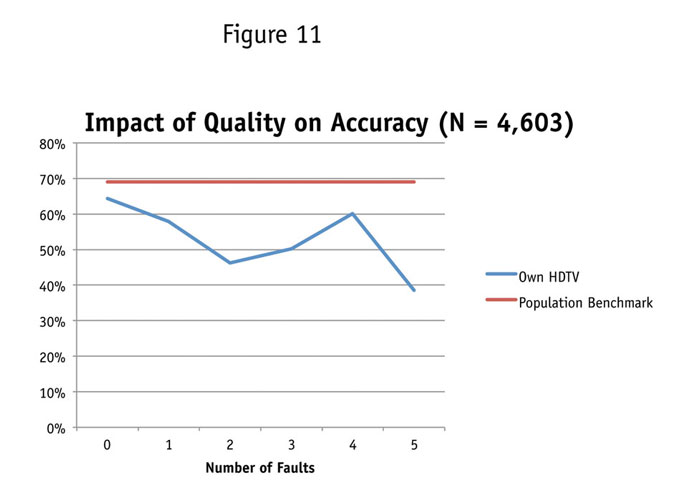 It is not always possible to include a question on smoking. Often the subject matter of the targeted study does not lend itself to the question. In Figure 11 we provide an example of where we used ownership of a high-definition television set as a discriminating question. The data is not quite as demonstrative as the smoking data.