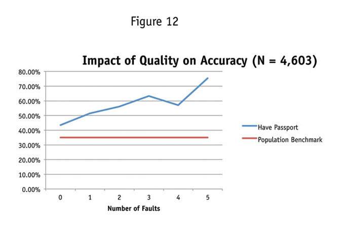 Those bearing a passport are well documented by the federal government, thus making passport ownership a reasonable reference point. We find that respondents who are poorly engaged tend to report higher than normal passport ownership. Here, respondents with three faults and above would be considered for elimination (Figure 12).