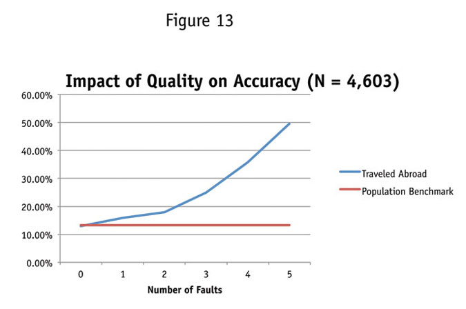 At times, it can be argued that we should expect some types of respondents to be poorly-engaged. Travelers might be thought to fall into that category. Time restraints of travelers might make them less patient with long surveys. At times we find that those with three or more faults indicate such high levels of travel that it is sufficient for us to discount the data they provide (Figure 13).