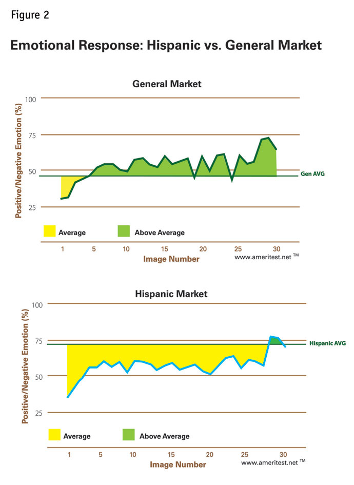 But on the second diagnostic, using pictures to retrieve the audience’s emotional experience of the ad, we saw a strong difference relative to the average. In other words, the general audience experienced much more positive emotions than the Hispanic audience (Figure 2) – which is why this ad was significantly more motivating to the general population.