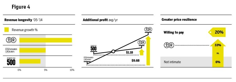 The goal of the ongoing study is to measure, validate and better understand how emotions impact brand relationships and further show which brands are most successful at creating these bonds. The team compiled the Top 10 companies using the Brand Intimacy Rankings, Fortune 500 and Standard & Poor’s 500 lists. For each brand, the team gathered the reported revenue and profit/loss for the years 2005 through 2014 from the brand’s annual reports and/or Form 10-Ks. From the data, the team calculated the average year-over-year growth rates for both revenue and profit for the 10-year period (Figure 4).