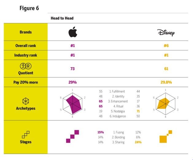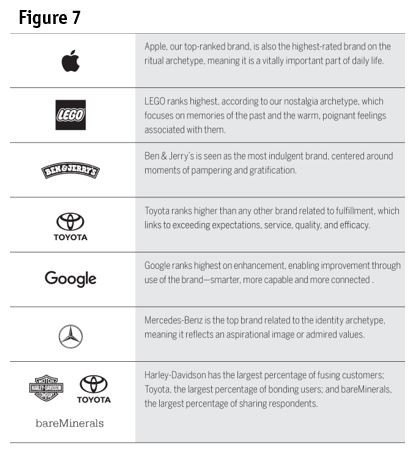 Looking across the rankings, it’s apparent that a brand may own a specific archetype in the hearts and minds of consumers, or it may be notable for its degree of sharing, bonding or fusing customers. Figure 6 shows a side-by-side look at two leading brands from the study, providing a brief overview of the components that contribute to each ranking.