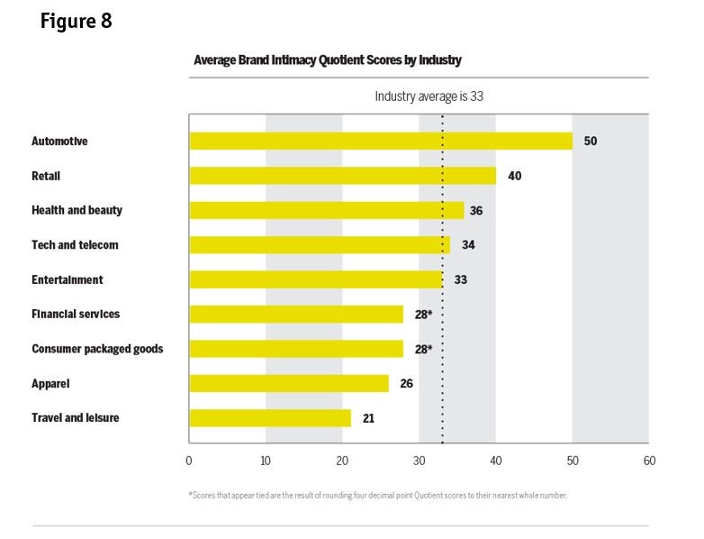Respondents completed a 20-minute survey that delved into the emotional connections that consumers have with brands across nine industries: automotive; health and beauty; financial services; retail; travel and leisure; apparel; technology and telecommunications; entertainment; and consumer packaged goods.