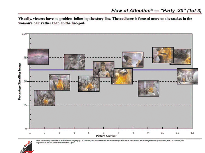 Fortunately, the means for developing such a strategy was already at hand. Ameritest’s Flow of Attention method, which we use in pre-testing commercials (Young, 2001), provides a way of choosing the four to six visuals which are used to construct the photoboard stimulus for online tracking.