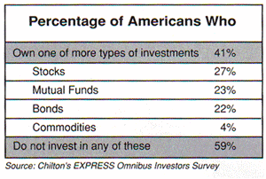 - Two out of five (41 percent) Americans now invest in stocks, bonds, mutual funds or commodities;