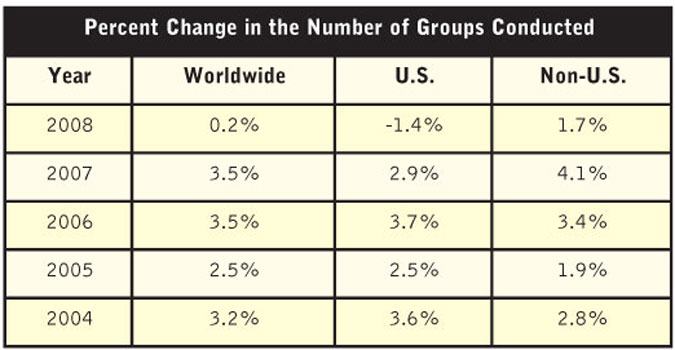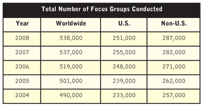 Still, many areas of research seem amazingly resilient. Take the venerable focus group, for example. Looking at the numbers from FocusVision Worldwide’s 2008 Focus Group Index, which were issued in May, the number of focus groups conducted worldwide in 2008 was 538,000, up 0.2 percent from 2007. Granted, the number of sessions conducted in the U.S. in 2008 declined to 251,000 from 255,000 in 2007 (the number of non-U.S.-groups increased by 1.7 percent from 2007 to 2008), but given that we were in the throes of a downturn for much of last year, it’s amazing there wasn’t a larger decline.