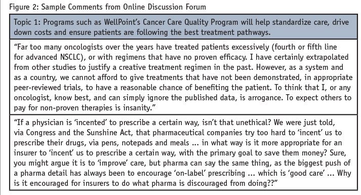 Beyond measuring awareness and knowledge, as the topic was explored further, we were aware that the debate surrounding the implications of the WellPoint program would elicit differing opinions. We also knew that opinions could be highly personal and rooted in larger issues of physician reimbursement and prescribing autonomy. We felt that the perceived effects of WellPoint’s program could be most fully explored by generating interaction between oncologists and we predicted that discussions may become somewhat charged.