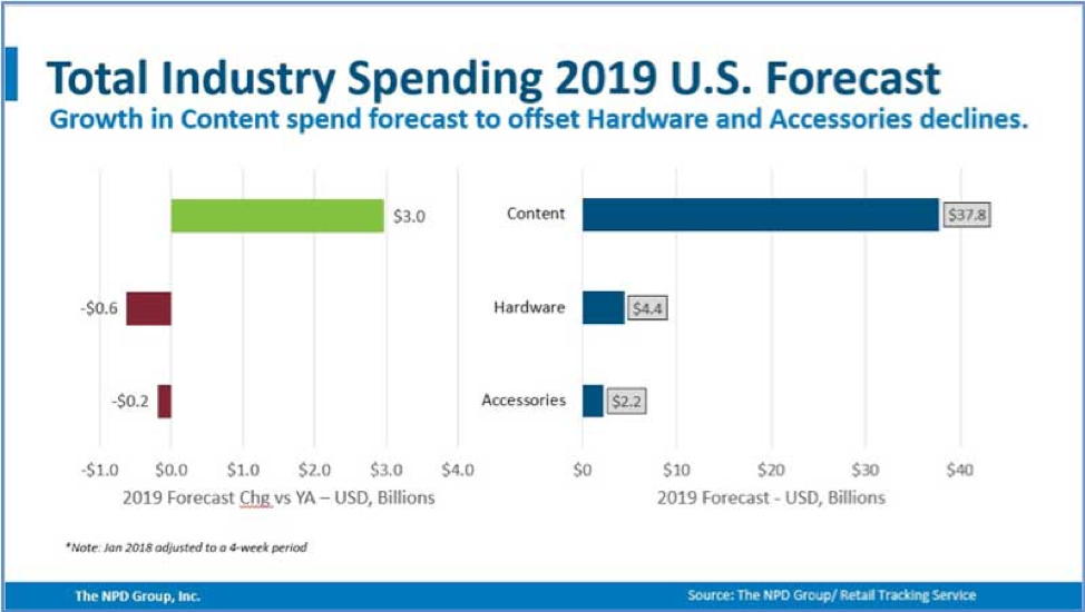 The forecasted 6% growth for total U.S. video game industry spending across content, hardware and accessories is considerably smaller than the 14% growth achieved in 2018 and 20% growth in 2017.