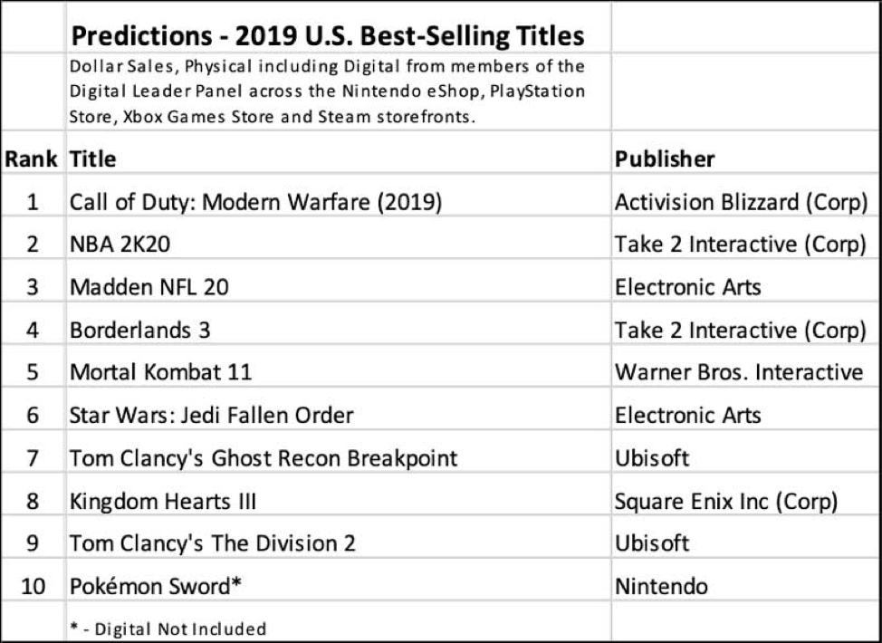 I am predicting Call of Duty: Modern Warfare to be the best-selling game of 2019 in the U.S. market. This would mark the ninth time a Call of Duty game has led the U.S. market in full game sales over the last 11 years. Following are my expectations for other top sellers: