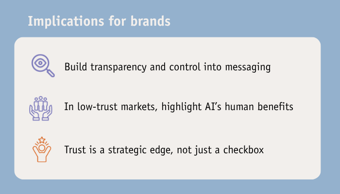 In high-trust markets, safety is assumed. In low-trust ones, safety must be proven. For Western audiences, AI must show up as transparent, predictable and user directed. Branding it as intelligent or efficient doesn’t land. What matters is control.