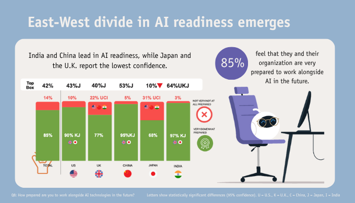 New findings from “AI’s great divide: East vs. West,” a global study by Kadence International, reveal how far behind the West is falling, not in infrastructure or innovation, but in belief. Just 21% of U.K. and 29% of U.S. respondents say they have expert knowledge of AI. In China and India, those figures leap to 92 and 90%. The metaphors people use reveal deeper emotional cues: in the East, AI is a “hero” or a versatile “Swiss Army knife.” In the West, it’s more often seen as a “sidekick.” In China, many describe AI as a “wild card,” reflecting both excitement and unpredictability.