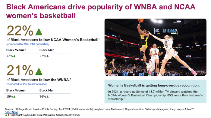 It is evident that media representation of women in sports is increasing. Media plays a pivotal role in promoting women's sports and reaching a broader audience. The rise in media coverage of women's sports has resulted in a boost in viewership and advertising spend. New data from Collage highlights how multicultural consumers are driving much of this fandom.