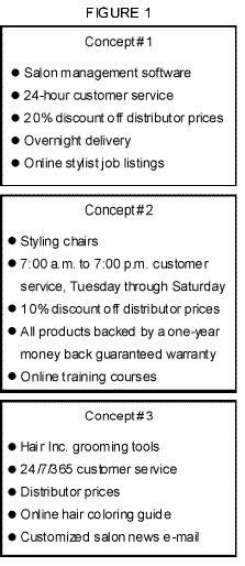 The next step was the creation of approximately 100 HairInc.com “concepts,” or various combinations of the elements. While each HairInc.com concept contained approximately five elements, high-level categories dictated the type of elements within each concept. All HairInc.com concepts contained elements related to must-have categories such as “product offering,” “pricing,” and “customer service.” A concept’s remaining two elements came from various nice-to-have categories, such as product warranty, delivery, and recruiting, that were not necessarily critical to include in HairInc.com.