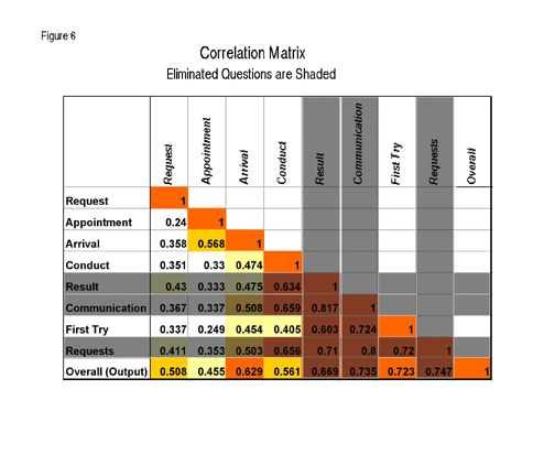 The goal is to leave questions that include at least one (often more) which is highly correlated to those which are not used and to have a logical understanding of its relationship to the discarded questions. To accomplish this selection, normally we look for inputs that have the highest correlation with other inputs as a first guess for elimination. In this example, Result, Request, and Communication fit that bill. The next step is to determine if among the remaining, there exists a question that can be a proxy for the removed items. A high correlation is the clue for identifying it. In this case, it is Conduct. A further examination of that correlated group suggests that the common denominator is information about the Result of the service call.
