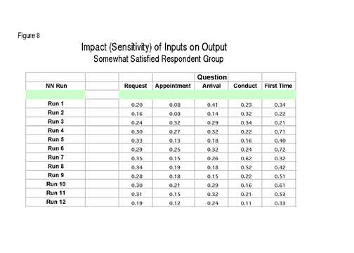For explanation, (using the example) we will assume four re-randomizing sequences. The results, after normalization, are illustrated in Figure 8. Only the table for the Somewhat Satisfied group is shown here. Similar tabular results exist for the Totally Satisfied and Dissatisfied. There are 12 selected "best networks" shown. Each row (of the 12) defines the impact or sensitivity for each input (the satisfaction element) on the output (Overall Satisfaction). The ratio is given as a percentage. By examination of Figure 8 it is important to note the extreme differences in sensitivities of the inputs in some of the 12 selected networks!