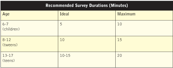 Below are some general tips in designing kid surveys (see chart for recommended survey durations):
