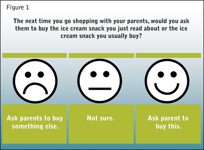 Because behavior is the bottom line, we believe in concentrating on the effects of the offerings, not the means. It’s more important to measure the behavior than the attitude behind it, especially for children who may not be able to understand or articulate their attitudes or feelings. It’s also important to measure the behavior alongside the alternative behaviors that could take place - in a choice context. Figure 1 shows an example of a choice-based behavioral question.