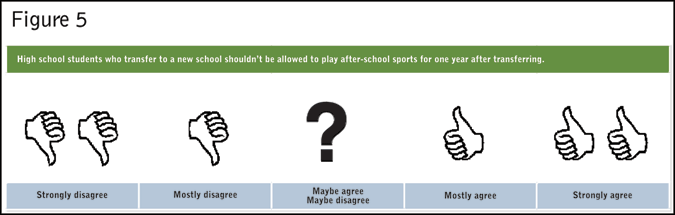 Finally, occasionally there are surveys that are largely attitudinal, not behavioral. These are not recommended for younger children and tweens because they usually can’t articulate or even understand their attitudes or opinions. Teens are developing the cognitive ability to express their attitudes on subjects relevant to them. Figure 5 shows an example of an attitude question that may appear in a study among high school kids.