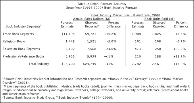 Table 1 presents year 2000 book industry forecasts for four key book sectors - trade, religious, education and professional - as well as a total industry forecast. Year 2000 forecasts exist for annual sales dollars and number of units sold for each book sector. The forecast estimates were excerpted from a 1995 “Books in the 21st Century” Delphi study providing market forecasts for the period 1994 to year 2000. The observed or reported book sector numbers were excerpted from a 2003 repeat Delphi study, “Book Market Outlook 2003-2012.” The Delphi methodology and forecast procedures employed in both studies were exactly the same and were performed by the same research consulting company. Both book market Delphi studies were sponsored by Print Industries Market Information and Research organization.
