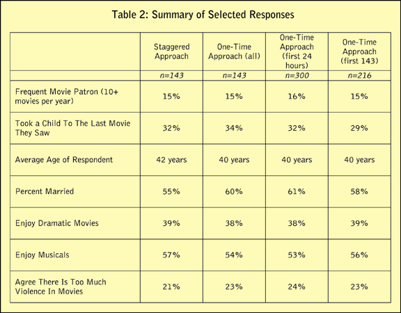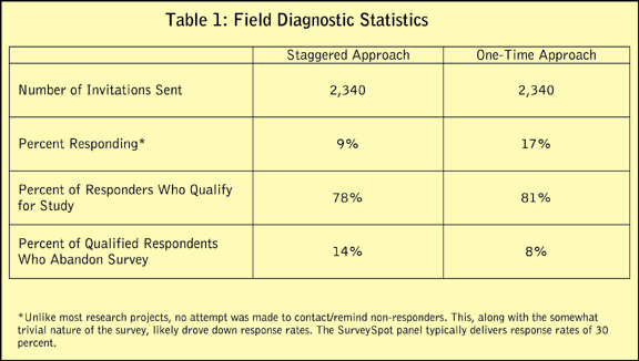 The other finding worth noting was the rate at which qualified respondents abandoned the survey. Those responding to the One-Time invitations were much more likely to stick with the survey than were those in the Staggered group. Response and incidence rates are shown in Table 1.
