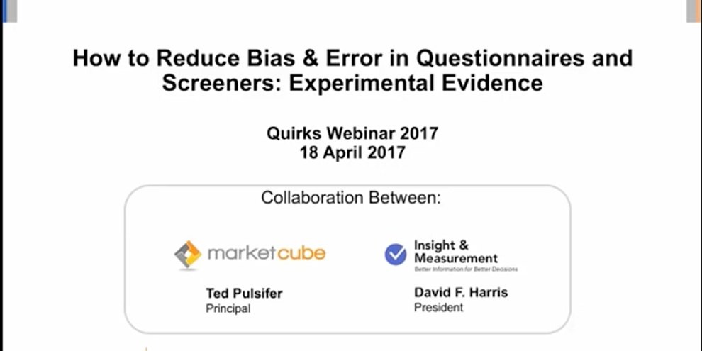 Editor's note: MarketCube and Insight & Measurement held a webinar on reducing error and bias in questionnaires and screeners on April 18, 2017. Duration 1:06:29.
