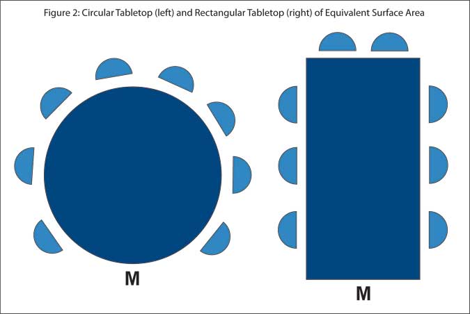First, if circular arrangements facilitate a sense of inclusion and protection that may encourage personal sharing, semicircular tabletops appear to do just the opposite, given that respondents in this latter type of setup are overtly exposed to an unknown audience. Second, when employing semicircular tabletops the average distance between respondents is greater than when using rectangular, trapezoidal or circular tabletops of equivalent surface area, something that would limit interaction. Third, although the view of other respondents is not obstructed by fellow participants, it would appear that the prominent placement of the moderator would magnetize visual attention toward this person, a fact that may affect the quality and quantity of group interaction. It follows that semicircular setups would work best for highly structured situations in which moderator control of the session is paramount; for example, when dealing with highly opinionated experts.