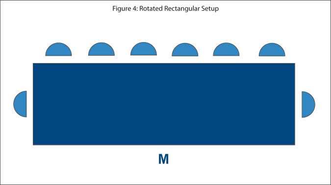 The rectangular (or rectangle-like) table is the most common setup available in focus group facilities. It allows the moderator to easily establish eye contact with respondents, although those sitting immediately to the left and right normally tend to fall outside of the moderator’s visual field. Moderators, therefore, usually make an extra effort to visually monitor the pair of respondents sitting to the immediate right or left.