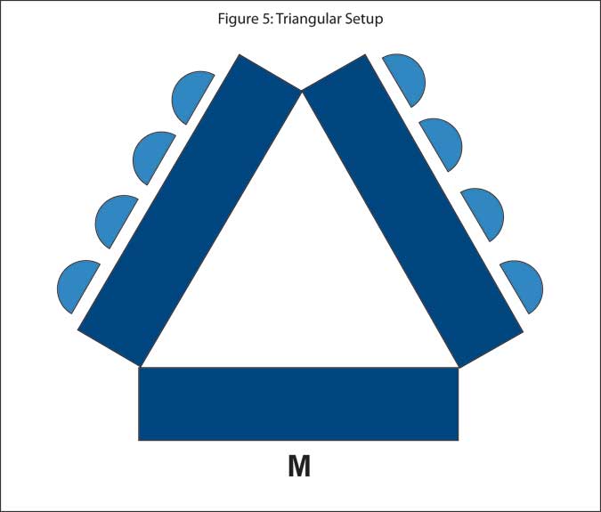 This rather unusual setup is very useful when conducting focus groups in flexible conference spaces such as those found in hotel meeting rooms. As described by one of my colleagues, three long, narrow tables, one of which is exclusively used by the moderator, are arranged in triangle form (Figure 5). With a camera placed behind and above the moderator, clients located in an adjacent viewing room should be able to have an adequate view of respondents. While smartly solving the problem of how to place a video camera in a hotel room, just as in the semicircular, rotated-rectangular and trapezoidal setups, in the triangular arrangement respondents’ vision is partially projected toward the moderator. However, in my opinion, this setup is a very intelligent compromise between the need to provide client viewing and the need to enable respondent interaction.