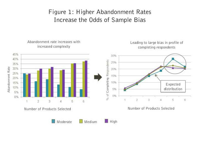 The answer was yes. As illustrated in the diagram in Figure 1, respondents who completed the medium- or high-complexity surveys were more tolerant of the increased question load (the more products they selected, the more questions they were asked), leading to bias in those groups compared to the group of respondents who completed the moderate survey. The graph on the left of Figure 1 shows that as the number of products selected increased - thereby increasing the number of questions to be answered - the partial or abandonment rate grew for the more complicated surveys.