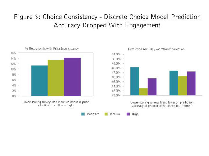 During this exercise, we noticed that the accuracy of the prediction (when the selection of “none” was also included) was 75-79 percent for all surveys, a relatively high prediction rate. However, the model for the medium- and high-complexity surveys gave a much greater emphasis to the “none” selection, meaning that the respondents for these surveys tended to select no product, as opposed to one of the available products. Once we removed the “none” option from our model, the prediction accuracy dropped significantly for the high-complexity survey. In addition, the lower-scoring surveys had more violations in price selection order, meaning the respondents tended to violate the expected order of selecting a lower unit price over a higher one. The net result: surveys with a low SurveyScore translated to lower predictability and thus to lower data quality.