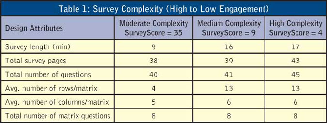 We computed and compared the SurveyScore for the three surveys. Predictably, it dropped precipitously with the higher complexity levels. The medium- and high-complexity surveys received an extremely low score, as shown in Table 1.