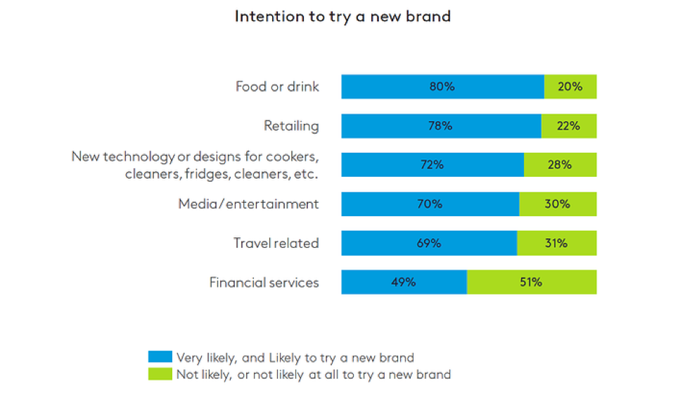 How likely are consumers going to be willing to test out a new brand in the marketplace? Eight out of 10 respondents stated they are “in with the new” when it comes to trying food and drink brands. Retail (78%) had a similarly high propensity, whereas financial services had the lowest intention to try a new brand (49%). At an overall level, defection appeared to be significantly higher in Asia and Americas regions than in Europe.