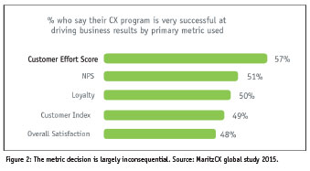 The truth of the matter is: It doesn’t matter. As the chart in Figure 2 shows, the choice of metric – such as NPS, Customer Effort Score, overall satisfaction, etc. – has little to no impact on whether the CX program is successful at driving business outcomes. If anything, one could argue that Customer Effort Score is slightly better. However, the results suggest that organizations that choose that metric are inherently more customer-centric to begin with.