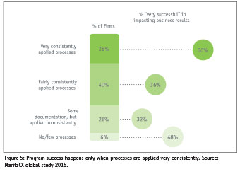 For example, when it comes to process documentation – one of the 14 core competencies – only 25 percent of the study respondents say that their companies document customer-related processes very consistently. However, two-thirds of those folks who report very consistent documentation say that their CX programs have been very successful at impacting business results (Figure 5). The data also suggests that doing something half way may, in some cases, be worse than doing little or nothing at all.