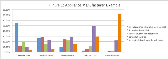 Finally, passives tend to be much more price-sensitive. TARP has correlated ratings of satisfaction with price and value for price paid with willingness to recommend and found that customers who assign passive scores are significantly more sensitive to price and perceive significantly lower value for price paid. See Figure 1 for an example of a major appliance manufacturer (N = 1,300) where passives show a 40 percent drop in satisfaction with value for price paid vs. advocates who give a top-box 9 or 10 score. While this might seem tautological, it reinforces the point that passives are NOT passive.