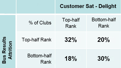 Let’s explore how external validation works. We also had access to actual member-loss (attrition) data for the sample of 162 stores/units. We composed a similar classification table displaying customer satisfaction rankings versus rankings in attrition data (lost fewest members to lost most members). The customer satisfaction process is again validated because the cell percentages in the top-top and bottom-bottom cells are both greater than the chance outcome of 25 percent.