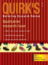 Part of the continued popularity is the fact that, for good or bad, focus groups have become identified with qualitative research. Many clients regularly say “We want focus groups” when they really mean “Let’s do something to understand how consumers [or executives] really think and feel, what their underlying emotions are” (a more long-winded request, to be sure). To some extent, the pendulum has swung to what I call the “anything but focus group” side: “Give me ethnography/depth interviews/whatever, especially if it’s new and different.”