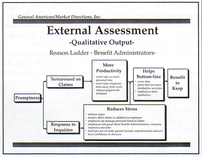 In the external assessment, Market Directions used qualitative and quantitative techniques, exploring satisfaction in various areas though interviews with brokers, benefit administrators and employees of client companies. Focus groups were conducted with benefit administrators and employees; in-depth telephone interviews were conducted with brokers.