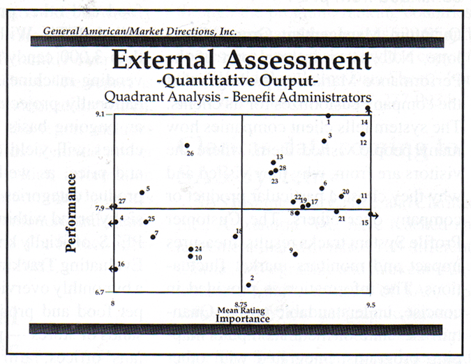 Advanced analysis was applied to routine cross tabs. Quadrant analysis provided an excellent look into the external assessment of General American and showed the company what was important and what needed to be improved on for high performance ratings. Factor analysis identified which attributes were most important, and regression analysis showed which factors carried the most impact on overall customer satisfaction.