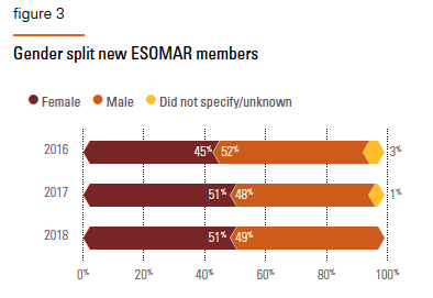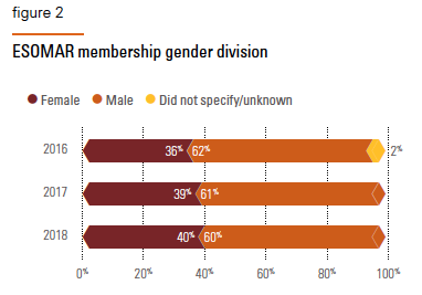 ESOMAR, a global nonprofit that promotes the value of market, opinion and social research and data analytics, provided us with information on its membership broken down by gender (Figure 2). In 2018, 40 percent of ESOMAR members identified as female, compared to 60 percent male. ESOMAR did note that the gender split is changing among new members. In 2017 and 2018, there were more new female members than male (Figure 3). The organization expects this trend to continue and has a goal of reaching a 50/50 representation among members.