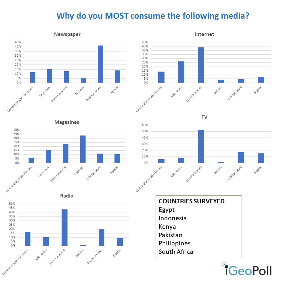 This article will highlight snapshot results from a continuous survey we’re running on the GeoPoll App to assess the media preferences, preferred channels and media consumption habits among our app users in Egypt, Indonesia, Kenya, Pakistan, the Philippines and South Africa.