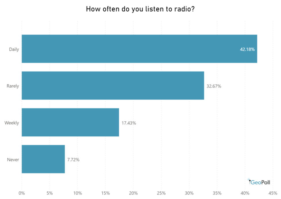 Radio may not be the favorite media channel, but most people (82%) said they at least occasionally listen to radio stations. In fact, the highest percentage (42%) said they tune in daily. The next highest percentage (32%) rarely listen to the radio, while 17% listen about once a week.