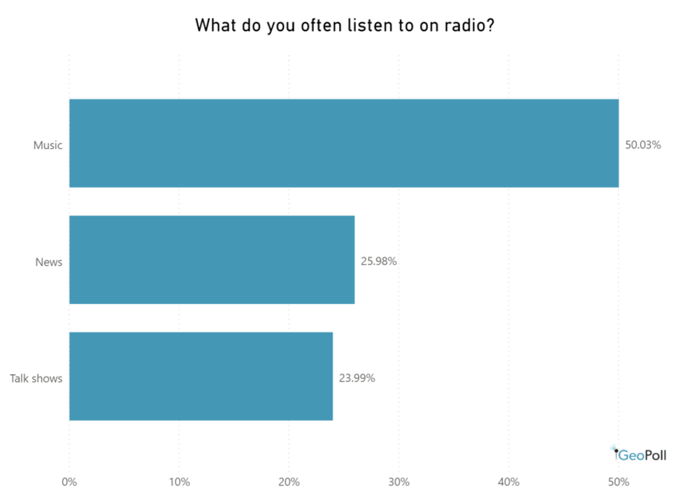 As to why they listen to the radio, half of the respondents said they listen to music while the rest mostly listen to news (26%) and talk shows (24%). This trend held in most of the countries surveyed with Pakistan being an outlier, as more people listen to news (44%) than listen to music (40%).