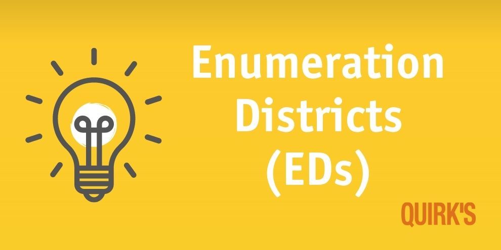 Enumeration districts, or EDs, are geographical subdivisions used in census and survey data collection. These districts average roughly 500 inhabitants. In the terms of marketing research, EDs are areas with relatively consistent population size. Researchers assign a code to each district, which makes the collection, analysis and interpretation of demographic and consumer behavior easier. What’s more, data can be segmented and analyzed at a local level.