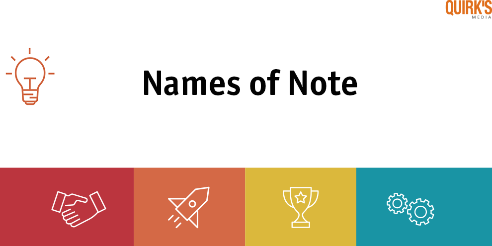 A regular feature in Quirk's Marketing Research Review magazine, Names of Note contains news on hirings and promotions and research and client companies.